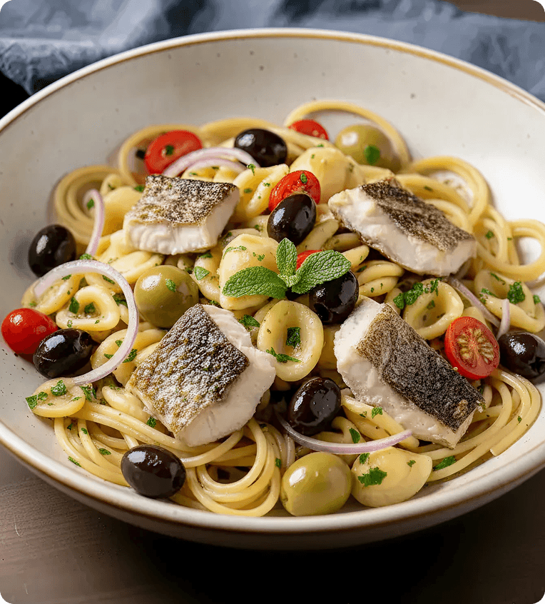 A bright, Mediterranean-inspired pasta with tender milkfish and a trio of olives — briny, savory, and satisfying.